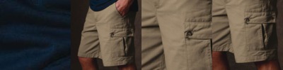 - Two pleated cargo pockets, two back patch pockets with concealed snap closures