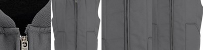 - Raw-edge hood opening, pocket seams, cuffs, waistband, zipper placket and side seams