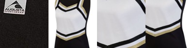 - Left side seam V-notch at hem accented with three-color trim