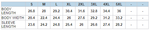 | Body Length | 28 | 29 | 30 | 31 | 32 | 33 | |