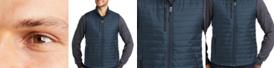 Staying warm while on the go has never been easier with our Packable Puffy Vests. Thanks to a water-repellent fabric coating and finish, you'll remain comfortable no matter where your day takes you. 100% polyester shell and lining 2.4-ounce, 100% polyfill insulation Interior storm flap with chin guard Front zippered pockets Reverse coil zippers with rubber-wrapped zipper pulls Adjustable locking drawcord at hem Port Pocket for decoration access Dyed-to-match drawstring carrying pouch included