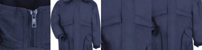 - Two concealed zippered pockets at waist, two lower insulated bellows with concealed snap flap, zippered pocket on left bicep, pencil pocket underside of storm flap