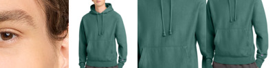 12-ounce, 82/18 cotton/poly fleece Reverse Weave cross-grain cut resists shrinkage 1x1 rib knit side panels, sleeve cuffs and hem Two-ply hood with dyed-to-match drawcords Front pouch pocket Embroidered Champion 'C' logo at left cuff Woven back neck label