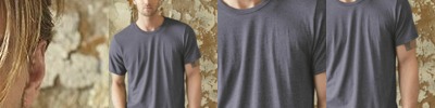 4.5 oz., 60% combed ringspun cotton/ 40% polyester fine jersey; Easytear™ label; contrast topstitched self-fabric sleeve stripes; double-needle hemmed sleeves and rounded bottom; sideseam construction; fit: adult unisex - true to size; self-fabric collar binding and back neck tape;