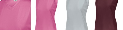 100% polyester wicking knit with True Hue Technology® that helps prevent dye migration; Moisture-wicking; Ladies' fit; Updated tailored fit; Tagless label; Outside locker label; Designed to be NFHS compliant;
