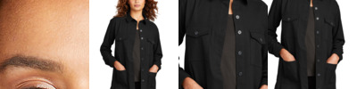 Boardroom-bound or loosely layered, this versatile twill overshirt combines the clean design of a blazer with just the right amount of stretch. The result fits in at work, at home and anywhere in-between. Fabric+Weight 7.2-ounce, 69/29/2 poly/rayon/spandex stretch twill Features+Benefits Open collar Faux horn-rimmed buttons Double chest pockets with button flaps Drop shoulders Deep back yoke with wide box pleat Lower patch pockets Adjustable rounded cuffs Longer length Rounded hem