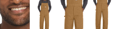 12-ounce, firm hand, 100% ring spun cotton duck canvas Quilted nylon lining to waist for easy on and off; 100% polyester insulation to waist for midweight warmth Adjustable elastic suspenders Multi-compartment bib pocket with zip closure Zipper fly Two large front pockets Hammer loop on right leg Seam-to-seam chap-style double-front construction Double-layer knees with openings for added knee pads and cleaning out debris Ankle-to-thigh leg zippers with storm flaps and snap closures Reinforced Cordura ® back-leg kick panels Two reinforced back pockets Metal rivets at vital stress points Carhartt-strong, triple-stitched main seams Carhartt label sewn on bib pocket 29-inch inseam Loose fit