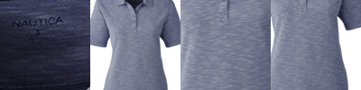 5.3 oz./yd², 64/36 modal/polyester slub knit jersey Vintage White under collar and side vents Nautica branded three-button placket Contrast-color neck tape J-Class logo on left sleeve Nautica wordmark at back neck Tagless label