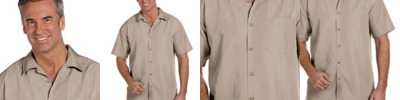 2.8 oz. 55/45 cotton/polyester; 2 chest pockets with button flaps; Hem sleeves ; Chainstitching on bottom hem; Modern Fit;