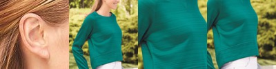 8 oz., stretch & sueded triblend terry; 51% rayon, 43% polyester, 6% elastine; 4-way stretch fabric withstriped loop back yarns; Scuba neckline with hidden snap button placket; Set-in sleeves & pouch pocket;