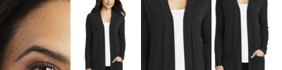 A versatile cardigan with ease of movement and a longer length, ideal for a busy life. 4.4-ounce, 62/33/5 poly/rayon/spandex jersey knit Open front Two patch pockets Hem vents