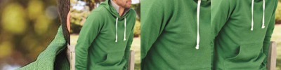- Raw-edge seams on raglan shoulders, side gusset panels, pocket and waistband